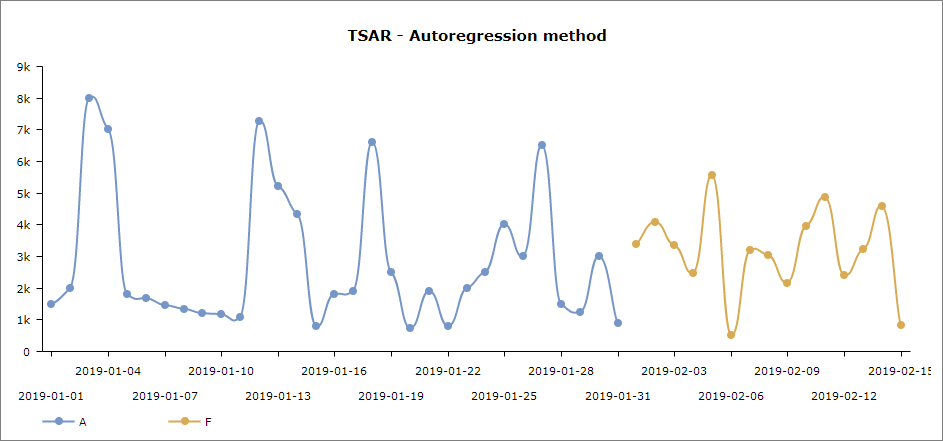 The following examples show a sales forecast based on the Autoregression method and Holt-Winters Exponential Smoothing method. The chart shows actual values (A) based on which the prediction is built, and forecasted values (F), also marked by a different color.